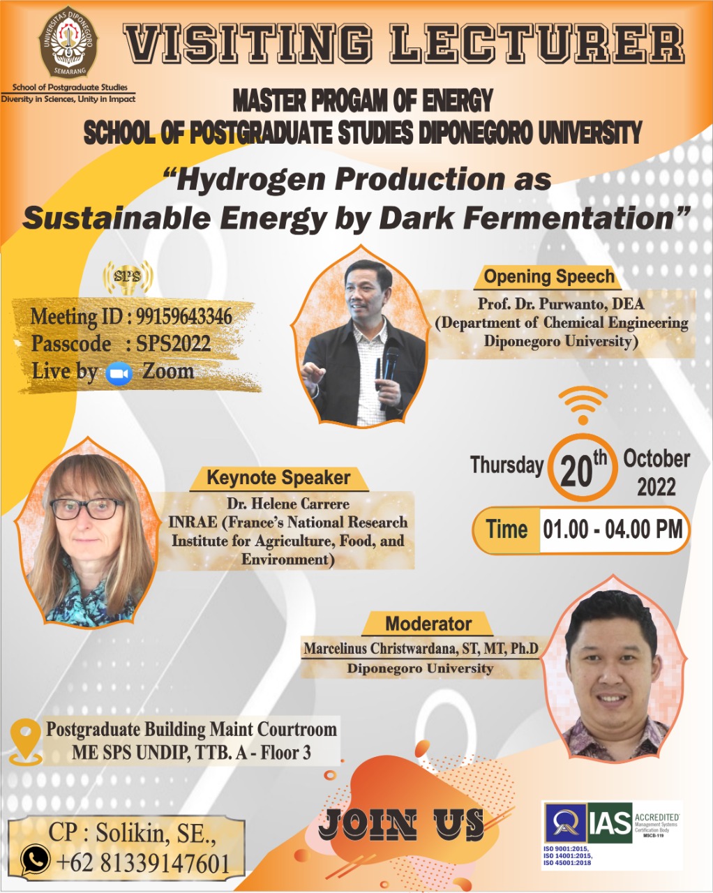 Diponegoro University’s Master of Energy held a Visiting Lecturer activity with the theme “Hydrogen Production as Sustainable Energy by Dark Fermentation” on Thursday 20 October 2022 at 13.00-16.00 WIB. This event will be attended by Dr. Helene Carrere from INRAE(France’s National Research Institute for Agriculture, Food, and Environment) as Keynote Speaker.