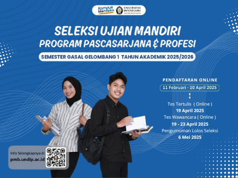 Dalam rangka penerimaan mahasiswa baru untuk Program Pascasarjana dan Profesi Semester Gasal Gelombang I Tahun Akademik 2025/2026, kami mengundang calon mahasiswa untuk mengikuti Seleksi Ujian Mandiri.